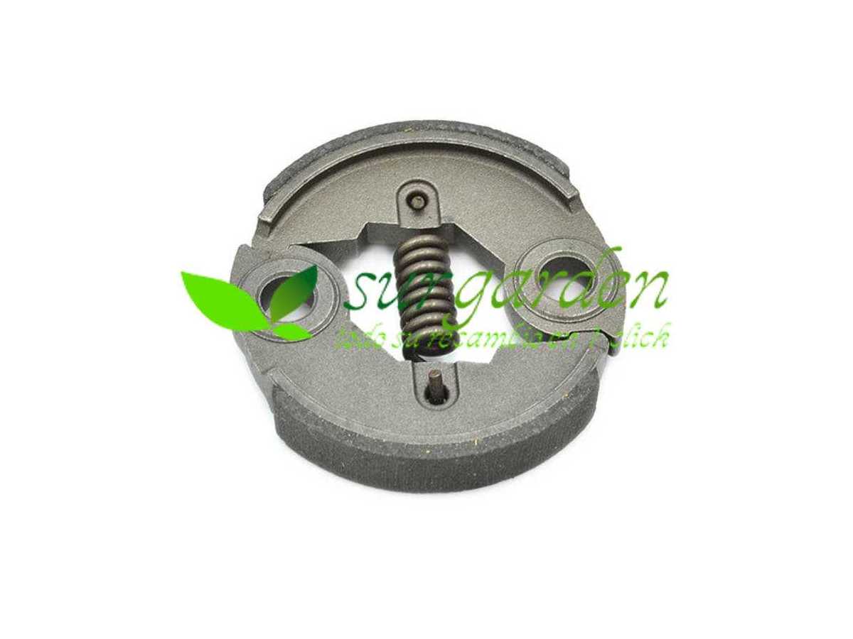 Embrague centrífugo adaptable a desbrozadoras con motor asiático genérico de 43 c.c. de cilindrada. Kit compuesto por 2 zapatas y muelle tensor.